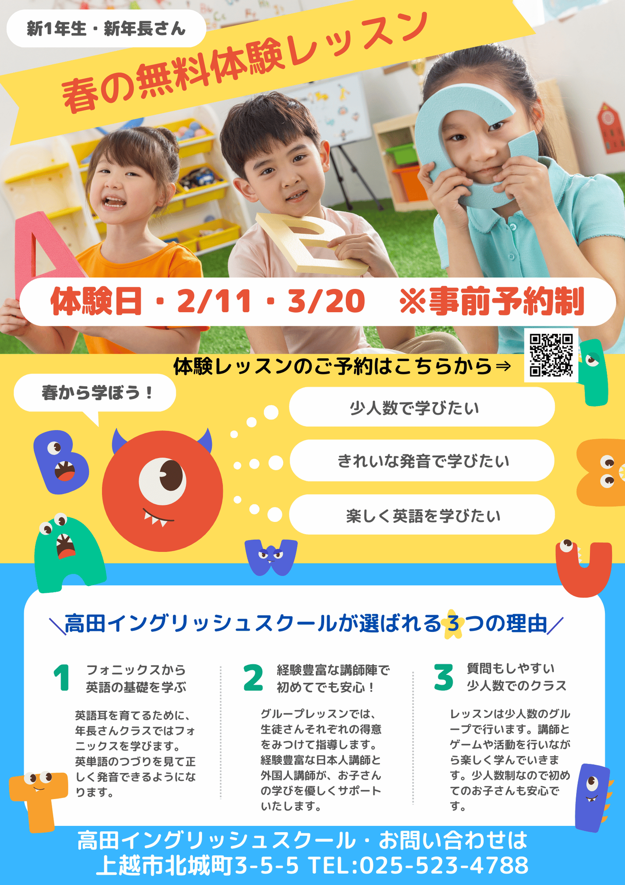 | 2024/1/15 | 現在当校では春の入会キャンペーン実施中です★新一年生の無料体験レッスン会を2/23(金・祝)・3/20(水・祝)で実施しております。先着順となっております。ぜひこの機会に外国人講師の英語レッスンを体験してみませんか?ご予約はお電話か体験申込専用のフォームからどうぞ → https://forms.gle/KcX3oMFMbbd9s9HX9